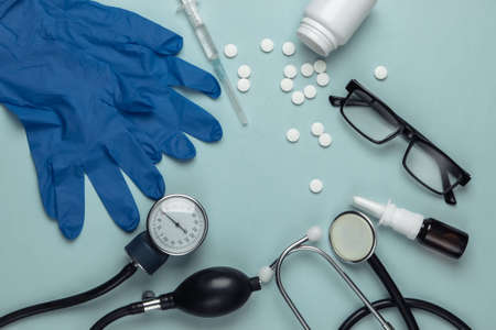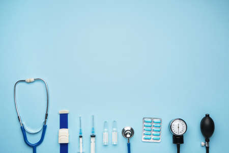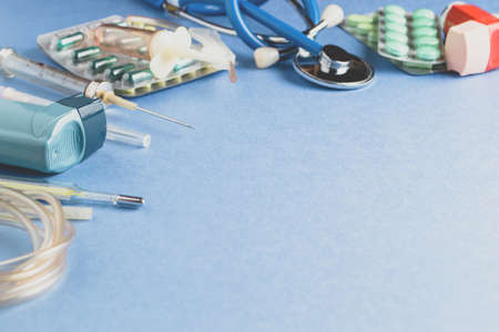 Medical blue background with different accessories: stethoscope, syringe and tablets.