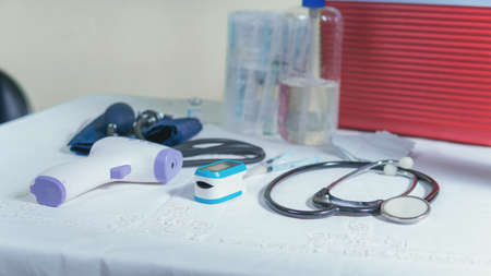 Stethoscope, pulse oximeter and thermometer gun on white background. Treatment of cold or flu. Phonendoscope. Infrared isometric thermometer gun to check body temperature for virus symptoms