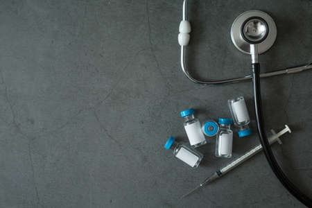 Top view of Many vaccine bottles , syringes and stethoscope on concrete background for virus concept and copy space