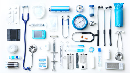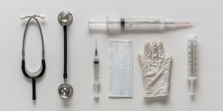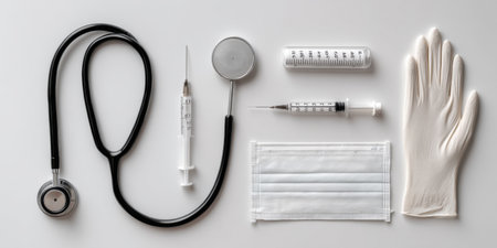 Flat lay of medical instruments including stethoscope, syringe, thermometer, mask and gloves on a clean white background. Minimalism, photorealistic, high detail, no brands, no logos.