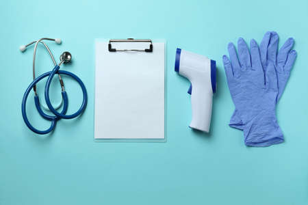 Medical tools and thermometer gun on blue background