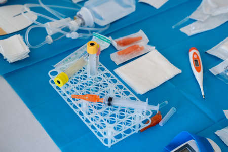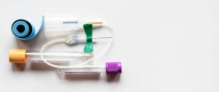 horizontal white background with copy space with medical material consisted in test tubes, tourniquete and needle for blood collection