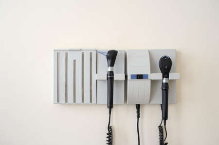 close up photo of a otoscope and ophthalmoscope hanging on a doctor's office wall