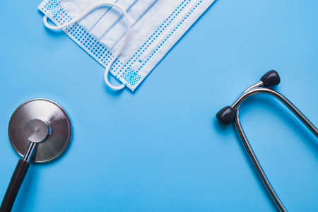Medical Protection Mask On A Blue Background, disposable cap and stethoscope top view
