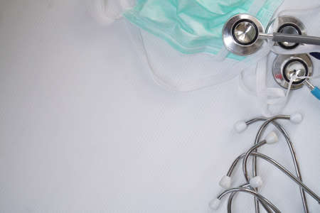 Medical mask, stethoscope and tablets for Corona protection concept.