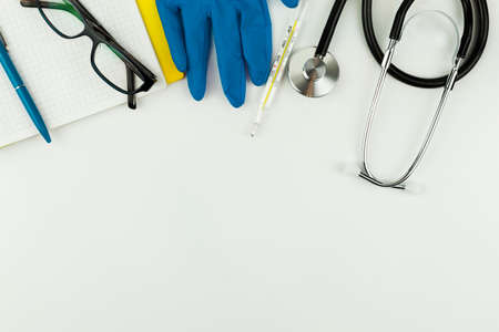 Medicine treatment concept. Electronic thermometer, phonendoscope or stethoscope, white gloves on blue background. High quality photo