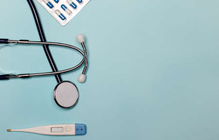 Pills, electronic thermometer and stethoscope on a blue background. Copy space. Medical concept