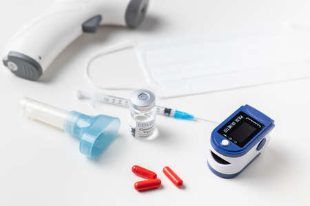 Medicine treatment, vaccination concept. Bottle with vaccine and injection syringe, electronical thermometer, stethoscope and vaccine vials on white background. High quality photo