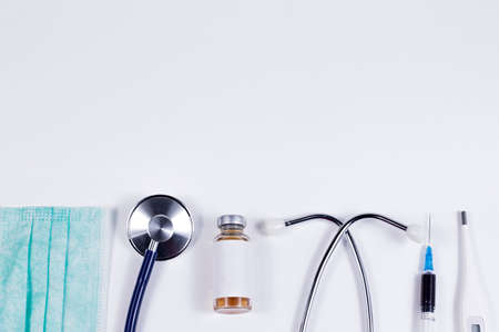 Medical equipment layout. Medical face mask, stethoscope, bottles with medicine and vaccine, syringes, thermometer and blue latex gloves on white background.