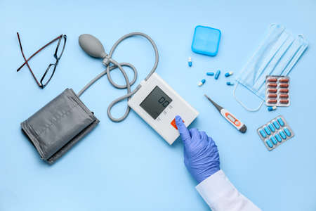 Hand of doctor, sphygmomanometer and pills on color background