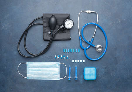 The set of a doctor for protection against coronavirus consisting of a mask, glasses, thermometer, syringes, ampoules and a stethoscope lying on a blue background in a studio