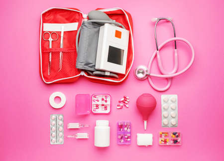First aid kit on color background