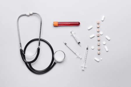 Medical layout on white background, flat lay. Blue stethoscope or phonendoscope surrounded by vials, ampoules and test tubes.