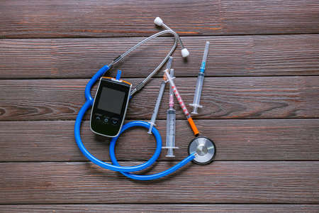 Glucometer, stethoscope and syringes on wooden background. Diabetes concept