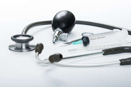 Stock photo of a stethoscope, a scissor, syringes and tablets on a white background. There is nobody on the picture.