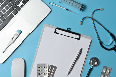 Top view of doctor desk with a stethoscope, capsule pills, syringe, digital thermometer, pen, wireless mouse, laptop and blank paper on the clipboard. Top view with copy space, flat lay.