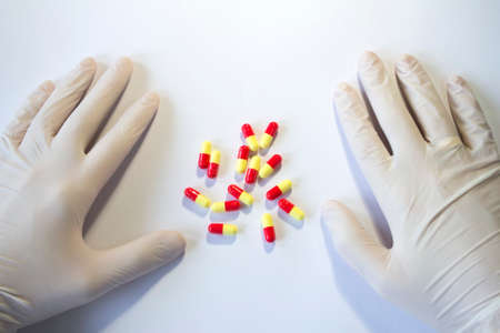 Hands in medical rubber gloves and red and yellow capsules in the center.
