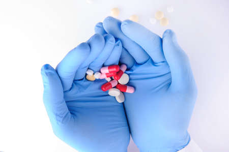 A hand with blue latex gloves grabbing hand full of medicines, Capsules for Vitamines,drugs,medication. Health,business concept