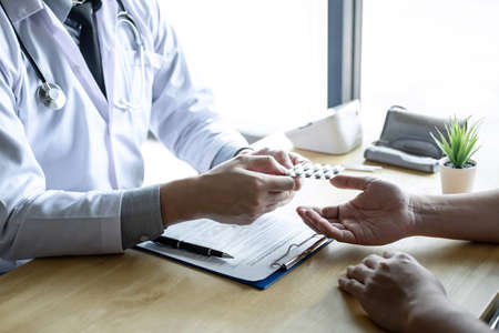 Doctor consulting with patient examining for using medicine, presenting results symptom about the problem and recommend treatment method, Healthcare and medical concept.