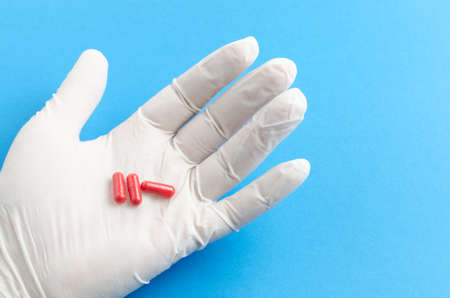 Doctor's hand in a blue medical glove holds a blister of pills on a blue background. Treatment