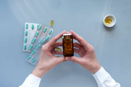 Womens hands hold a glass jar of pills antibiotics. Healthcare medical accessories therapy concept. Doctor workplace in hospital.