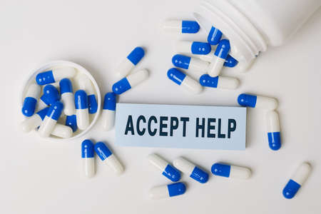The Text - Accept Help, written on paper note near blue-white pills spilling out of pill bottle. medical concept