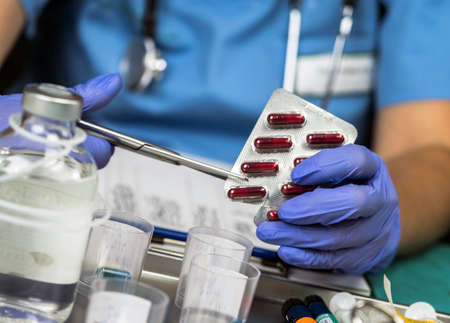 doctor holding medical drugs, pills. hands in blue latex gloves