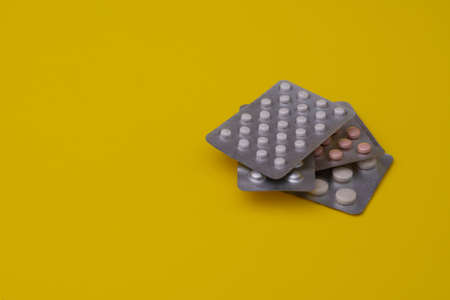Blisters with pills, for health and protection. Yellow color with green capsules, white, sealed in silver packages on a blue background. Slimming, anti-aging or anti-virus products. Contraceptive