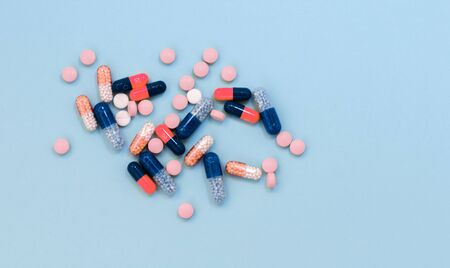 Heap of colorful pills, tablets, capsules on blue background. Drug prescription for treatment medication health care concept wth copy space