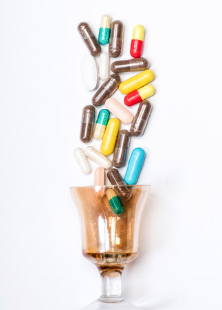 Medicinal drugs and medications. Colorful caplets spill over glass. Medications isolated on white