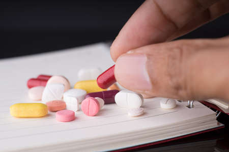 Man's hand picking up a medical pills from a bunch of pills.