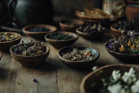 Wooden plates filled with folk herbs, alongside medicinal pots and cups, set against a dark navy blue background. A serene and elegant scene for health care advertising.