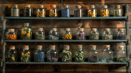 A wooden shelf displays an array of glass jars containing different dried herbs. The warm ambiance reflects the cozy atmosphere of a rustic cabin, inviting exploration.