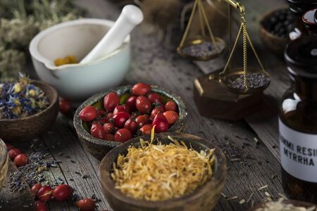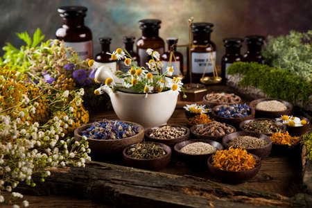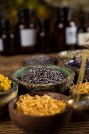 Alternative medicine. Herbs in bowls, mortar and medicine bottles on wooden rustic table.