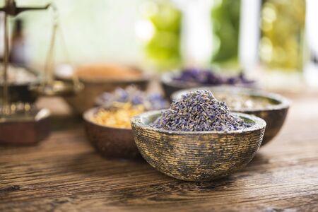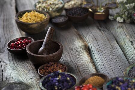 Bowls and jars of dry medicinal herbs on table. Healing herbs assortment. Alternative medicine.