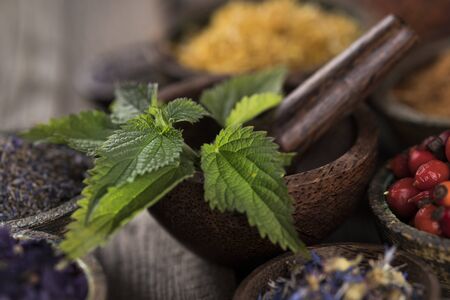 Medicinal herbs on minimalist background. Free space for text, natural health, wellness, selective focus.