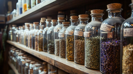 Row of glass jars filled with assorted dried herbs on wooden shelves, evoking a rustic apothecary or herbal store setting with natural, organic vibes.