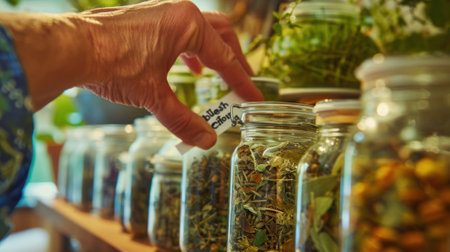Grandmother makes tea with medicinal herbs. Selective focus.