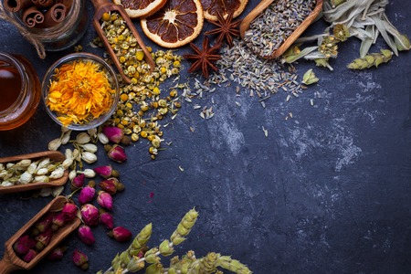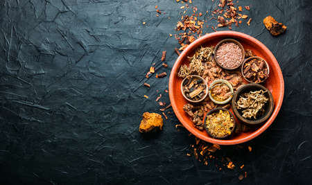 Medicinal herbs in herbal medicine. Dried healing plants. Space for text