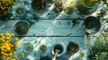 Modern flat lay style showcasing herbal medicine and cosmetic background