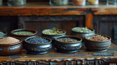 Chinese traditional medicine concept with herbal and spicy visuals using a traditional bowls. Preparing herbal remedies, highlighting the ancient wisdom of holistic healing. Generative ai.