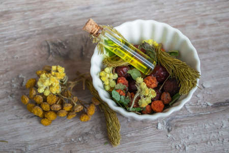 Dried herbs and flowers in white mortar on rustic board, summer decoration, herbalism