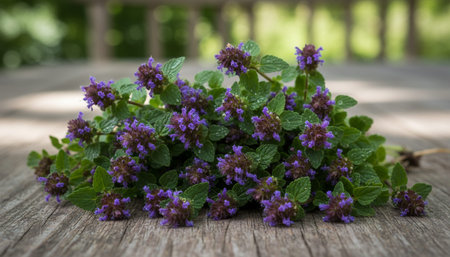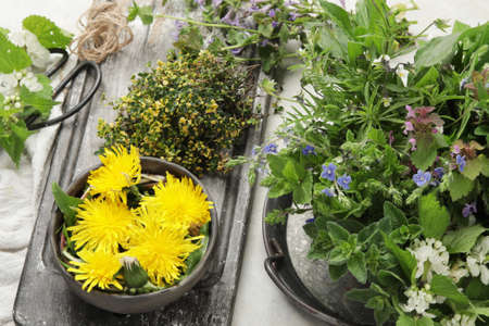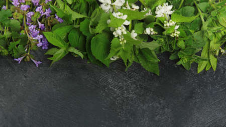 Fresh medicinal herbs and wild flowers top view