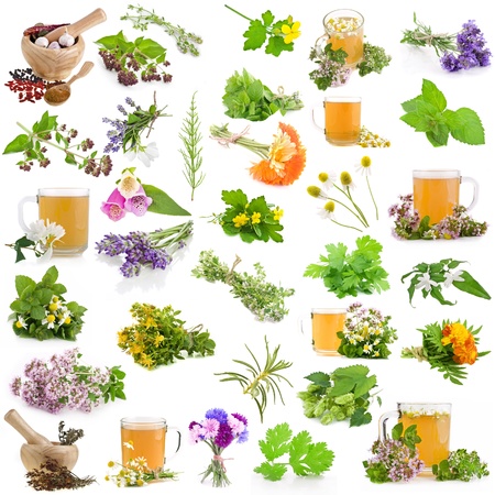 Set of fresh blooming medicative herbs, leaves, plants, isolated on a white background