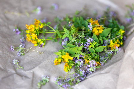 Hypericum perforatum, St Johns wort and Thyme fresh flowers drying on the paper