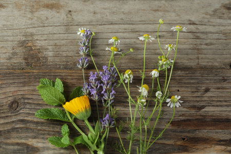 Beautiful calendula, lavender, mint and chamomile flowers on wooden table, flat lay