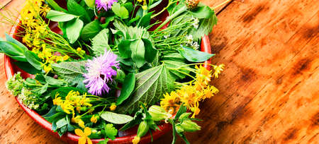 Alternative medicine, set of medicinal herbs and flowers.Natural medicine and homeopathy.Wooden table