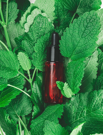 Red glass bottle with a pipette for cosmetics and green mint leaves, top view
