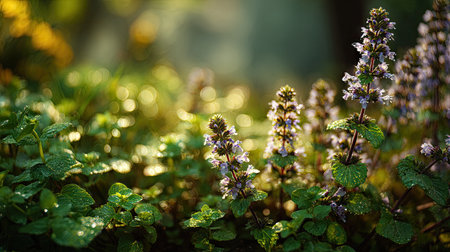 A panoramic wide view of Catmint garden growing closely together in a dewy morning shining droplets on leaves warm soft daylight ultra realistic photography cinematic wide composition lifelike natural scene