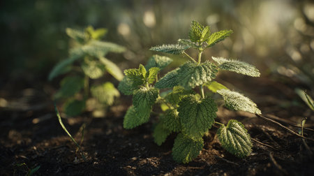 Mint with small fresh leaves, growing upright in fertile soil, sunlight filtering gently, realistic textures, vibrant green tones, natural photography style, wide balanced composition for timelapse video.